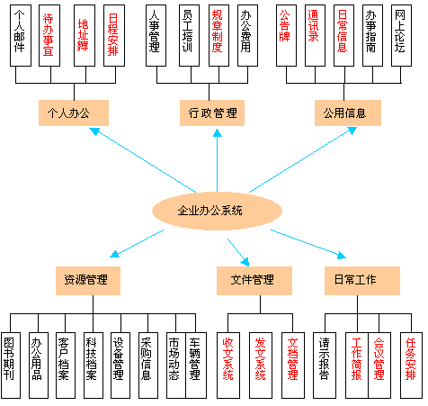 企業(yè)辦公系統(tǒng)的主要目標(biāo)是實現(xiàn)企業(yè)辦公及事務(wù)管理,有效地提高企業(yè)辦公效率、節(jié)約辦公經(jīng)費、創(chuàng)建企業(yè)文化。是辦公系統(tǒng)與管理信息系統(tǒng)的結(jié)合,系統(tǒng)有多個單獨模塊組成,體系結(jié)構(gòu)如下: